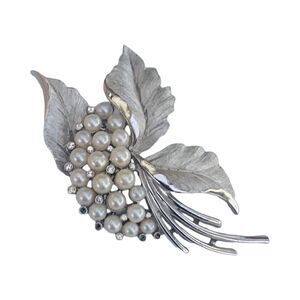 This vintage TRIFARI brooch is a stunning piece of costume jewelry that will add a touch of elegance to any outfit. The brooch features a beautiful round imitation glass pearls as the main stone, which is surrounded by a cluster of rhinestones crystals. The leaf shape of the brooch is turned and dimensional, with a unique setting style that is sure to catch the eye. The brooch is 2.5 inches in length and is adjustable for the perfect fit. It is signed by the designer and is a genuine piece from the 1960s. This retro piece is perfect for those who love vintage silver jewelry, flowers, and plants. It is a great addition to any collection and will make a wonderful gift for a special occasion.PLEASE NOTE MINOR STONESMISSING NEED REPLACEMENTS.