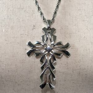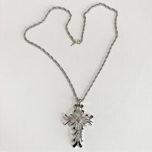Rare Vintage Crown Trifari Silver tone Necklace With Large 3 Inch Stylized Tribal Maltese Cross Pendant on Original 24" Chunky Rope Chain, MCM Estate Jewelry