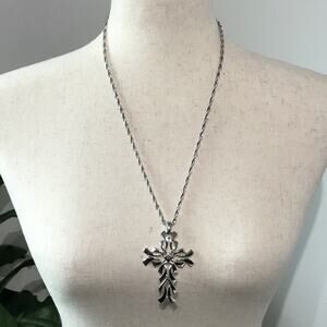 VTG Crown Trifari Stylized 3 Inch Tribal Maltese Cross Rope Chain Necklace 24"
