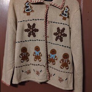 VTG Crystal Kobe Fall gingerbread Christmas Embroidered Knit Cardigan Sweater LG