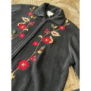 VTG> Crystal -Kobe Zipper front Cardigan Sweater floral Embroidery SZ L