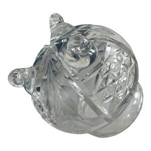 A charming vintage **cut crystal condiment / jam / sugar jar** with a spoon notch built into the lid — perfect for serving jams, mustard, sugar, or relishes. The jar stands on three scroll feet and features deep cut patterns in floral and crosshatch designs.
