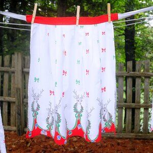 VTG Cute Reindeer w/ Wreaths & Bows Christmas Hostess Apron 8 Waistband Pleats
