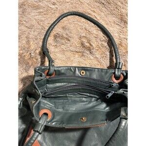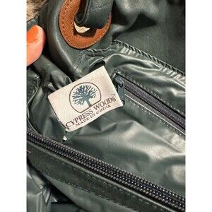 This vintage Cypress Woods large tote bag in green and tan features a solid pattern with multiple inner pockets. It has a zip and magnetic closure, green leather handles/straps, and a leather lining. The exterior is made of leather with a vintage style, perfect for women looking for a stylish and functional handbag.