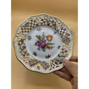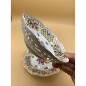 VTG DRESDEN Schumann Porcelain Reticulated Candy/Nut Dish and Bowl Floral Gold