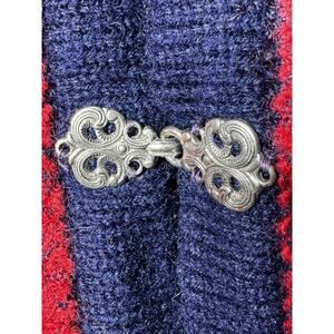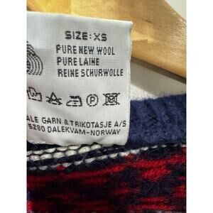 Pure alpine craftsmanship—this Dale of Norway cardigan embodies timeless winter style. Deep navy wool, hand-finished red trim, and pewter clasps shaped like Nordic filigree. The reindeer motif and snowflake border are Dale’s signature, inspired by patterns used for over a century. Warm, heavy, and built to last. Made in Norway from 100% pure wool. Beautiful vintage condition, no visible flaws.