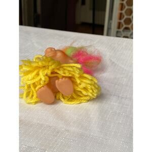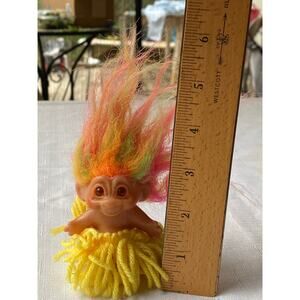 Vintage Dam Troll Doll in yellow yarn Hula "grass" skirt. Neon rainbow hair, red eyes. Approximately 3 in tall. Hawaii Pacific. Excellent pre-owned condition. No issues.