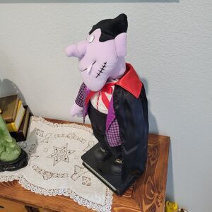 The product is an 18" tall singing and dancing vampire figurine for Halloween. It is powered by 3 C batteries included and features multicolor illumination. This collectible item from the late 20th century is perfect for adults looking to add some spooky fun to their Halloween decorations. The figurine is an original piece with a Halloween theme and musical features, making it a unique and entertaining addition to any Halloween display. Brand new batteries included.