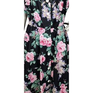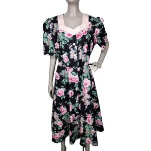 Vintage 80's black with all over pink roses, Queen Ann neckline, high shoulders, puffed half sleeves, button-front, fit and flare midi day dress, has pockets, shoulder pads (easily removed) size is marked 6, fits a modern M/L/XL depending on your measurements and desired fit, dress is NEW, NWOT, NOS, Deadstock, never worn,
