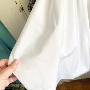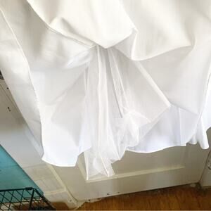 Vintage Dave & Johnny 1980s Style Prom Dress Mesh Neckline Oversized Bow Size 9/10 Juniors. Good, preowned condition. A few marks, one larger stained spot on skirt—unsure if they would come out if dry cleaned. See up close detail pictures. Honestly, hard to see when worn because of pleating in skirt. Bow stitching is a little loose. Shoulder pads. Sheer paneling in front with rhinestone detailing. Large now at drop waist. White mini skirt with crinoline underneath. Long sleeves.