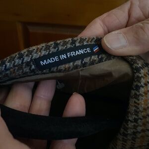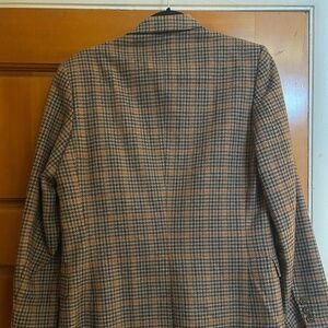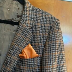 Multi browns houndstooth in a blend of 30 cashmere, 30 wool and 40 poly, 2 button, center vent. Size 38R it measures underarm to underarm 19", shoulder to shoulder 17", sleeves 25" and overall length 29.5".