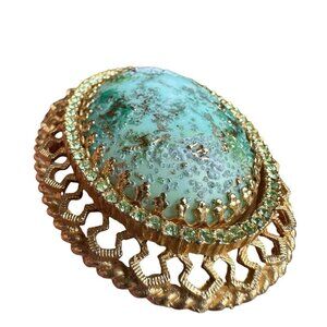 Add a touch of vintage glamour to your collection with this stunning signed DeNicola with stamped maker's marks statement 2.25" brooch. The oval-shaped brooch features a beautiful green and gold color combination that is sure to catch the eye. The brooch is signed and crafted from mixed materials, with a gold-plated and gilt metal finish. The Easter Egg cabochon has various shades of green light blue and gold flakes along with texture in the matrix, it is hand set into ornate serrated bezel then ringed with small round lime green color crystal rhinestones. The yellow gold plating or dipped metal is a perfect complement to the cab and stones. This rare vintage MCM DeNicola signed brooch is in Excellent pre owned clean condition, trace use wear on high spots of the properly functioning pin clasp, well curated in a wealth Dallas, Texas estate collection. Please review pictures for more details and size measurement information, thank you.