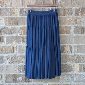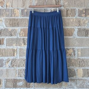Vintage 1980s navy blue flowy tiered midi maxi skirt from Deborah Murray. Made in Canada. 100% rayon. Super stretchy elasticized waistband. Unlined. Lightweight. No flaws.