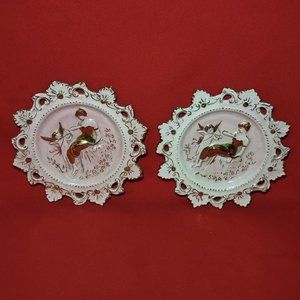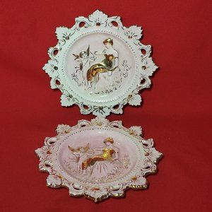 VTG Decorative Dish Cupid & Victorian Woman Gold Pink Painted Fluer De Lis Borde