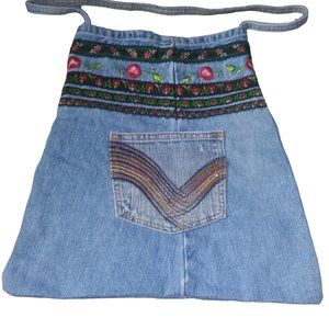 VTG Denim Blue Jean Crossbody Red Floral Pocket Rainbow Striped Tote Handbag HTF