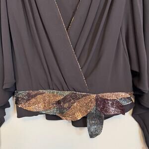 VTG Denise Fashions Blouse M Black Pleated Surplice Sheer Batwing Beaded Hem USA