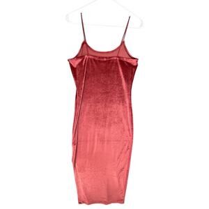 This is a sleek and stylish midi dress featuring a soft velvet texture in a beautiful rose or dusty pink color. It has thin spaghetti straps and a form-fitting silhouette that falls to a midi length. The dress is perfect for a party, night out, or special occasion.
