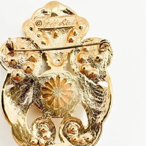 VTG Designer Jeff Lieb Brooch Gold Tone Clear Rhinestone Purple Glass Pearl Drop
