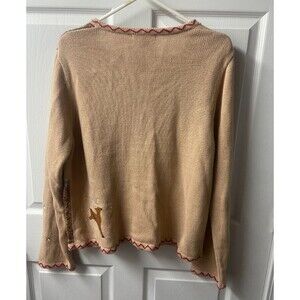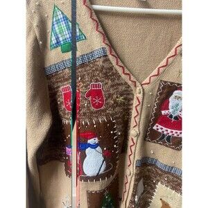 The VTG Designer Original Studio Joy Christmas Tree Beaded Cardigan Sweater for Women in size XL is a festive and stylish addition to your winter wardrobe. This V-neck sweater features a solid beige color with a Christmas tree pattern, perfect for the holiday season. Made from a blend of ramie, cotton, and cotton knit fabric, this cardigan is adorned with beads and holiday-themed accents, adding a touch of sparkle to your outfit. Hand wash only to keep this vintage piece looking its best, and wear it for casual occasions with a regular fit for a comfortable and chic appearance.