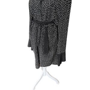 Chic and timeless vintage Diane von Furstenberg 100% silk dress featuring black and white polka dots with contrasting micro dots at the collar, cuffs, and matching waist tie belt. Versatile V-neck or button-to-neckline design allows two sophisticated styling options. Hits around the knee with a flattering, relaxed silhouette and fluid silk drape.