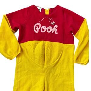Adorable vintage Winnie the Pooh fleece costume from The Disney Catalog! Features Pooh’s signature red and yellow colors, a hood with bear ears, and embroidered “Pooh” lettering with a little bee detail. Soft and cozy one-piece jumpsuit design with elastic cuffs and a back zipper for easy dressing.