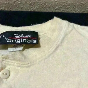 Incredible piece. Old school tag. Embroidered Mickey getting ready to play baseball. Red sleeves, beige body. 3 button Henley style neck. Perfect for baseball season. Very good vintage condition. Average to normal wear. One light yellow mark. No snags tears rips, measurements in photos. Has been laundered and is clean. Adult size L / Large.