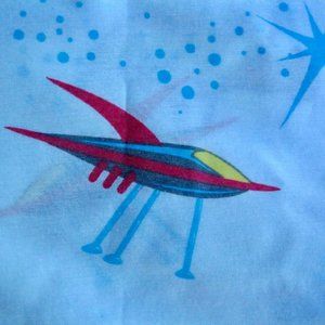 Vintage Toy Story sheet featuring Buzz Lightyear flying with colorful rockets in space. Cotton/polyester blend. Twin size.