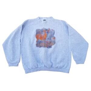 Light heathered gray cotton poly blend fabric, long sleeves, crew neck, ribbed cuffs & bottom band. Front is embellished w/ a heavily distressed/worn print of deer in the woods. Exact age unknown, but likely Vintage 90s Y2K. Issues noted in photos. Very good preowned condition. Size XL by tultex. Listing as Men's, but easily a unisex piece. Perfect for further distressing, crop job, oversized boyfriend fit.