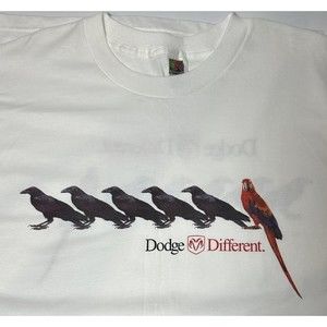 Show off your love for classic cars with this Dodge Different Puerto Rico Crows Ad Promo T-Shirt Made in the 90's. Made from machine washable cotton, this vintage tee features a graphic print of 5 crows in a line ending with the 6th bird as a scarlet macaw. The words " Dodge Different" printed on the front along side the classic Ram emblem. The shirt's round neck and short sleeves make it perfect for wearing during the summer, fall, or spring seasons. It is available in size XL and has a regular fit. The shirt is part of the Fruit of the Loom Heavy Cotton product line and is perfect for any car enthusiast looking to add a unique piece to their collection.