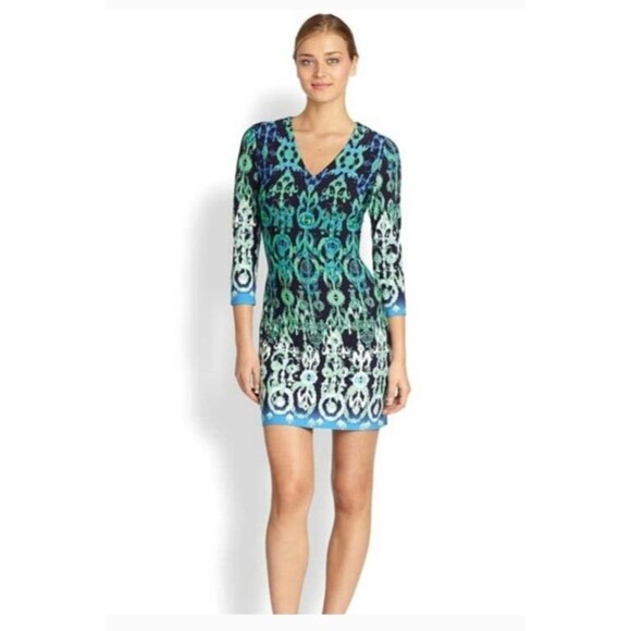 VTG Donna Morgan 8 Peacock Blue Green Stretch Resort Cruise Knee Length Dress