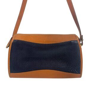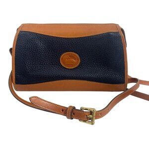 This vintage Dooney & Bourke crossbody bag features a classic navy blue design with tan trim, perfect for versatile styling. Made in the USA, it includes a zip-top closure and an elegant charm.