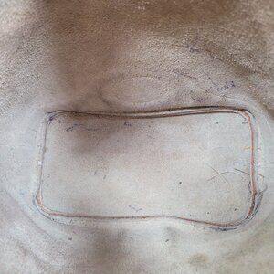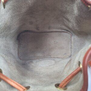 This Dooney & Bourke pebble leather bucket bag features a drawstring closure and adjustable strap for versatile carrying options. Its spacious interior makes it a practical choice for everyday use, while the tan and brown color palette offers a classic and timeless aesthetic.