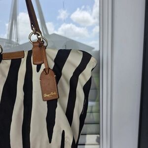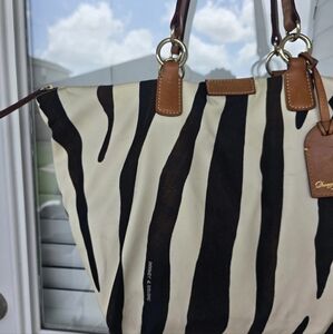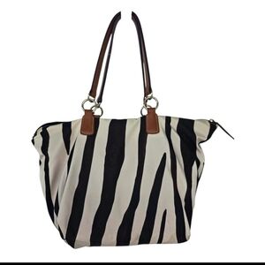 VTG Dooney & Bourke Zebra Print Tote Bag Nylon Leather Trim White Black Brown