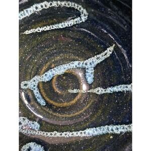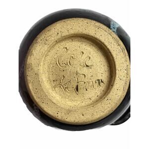 This Studio Pottery Dough Bowl is a unique piece of art made of clay in America in 1970. The bowl has a black color with a blue swirl, and it measures 5.75 inches in diameter, 4 inches in depth, and 4 inches in height. It features a pour spout, handle, and has a glossy finish. This original vintage bowl is handmade and signed by Cole LeR. The backstamp is impressed, and it's an original piece, not reproduction.