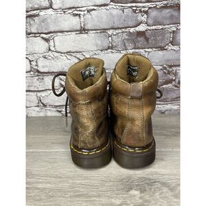 Vintage Dr. Martens lace-up boots in brown leather, suitable for both men and women in UK size 4, US size 5, and EU size 35. These combat boots feature a round toe shape, low block heel, and ankle shaft style. They have accents like lace and eyelet details, with a rubber outsole for comfort and slip resistance. The boots also offer cushioning, arch support, and are adjustable for a customized fit.
