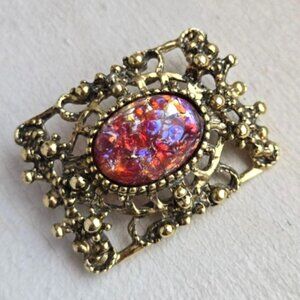 This vintage brooch features a mesmerizing dragon's breath fiery pink-red glass cabochon set in intricate filigree. Perfect for adding a touch of vintage elegance to any outfit.