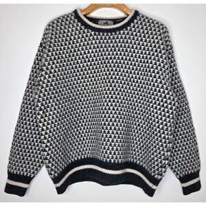 Thick vintage EMS sweater with relaxed 90s slouchy silhouette. Has an interesting, not-quite-houndstooth geometric pattern with contrasting crew neck & cuffs. It is thick and heavyweight with that rough wool texture. This piece is in excellent condition for its age- no holes or stains.