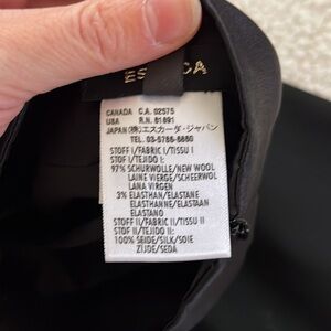 VTG ESACDA Virgin Wool black knee-length pencil skirt w/ruffle size 34/US 2-4. Luxurious black fabric with satin waistband, side zipper, and ruffle kick detail at the knee to allow for more mobility. In like-new vintage condition!