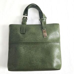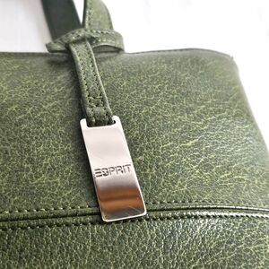 This vintage ESPRIT army green hand tote is a small cute size. Made of thick faux leather with silver accents including a logo hang tag. Super well made. There's an interior center zipper pocket that can be used to divide it into 2 compartments or pushed to the side for full use as a single compartment.