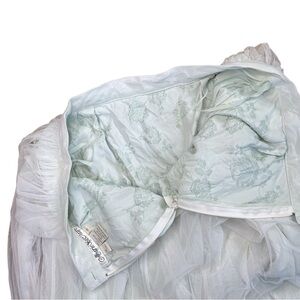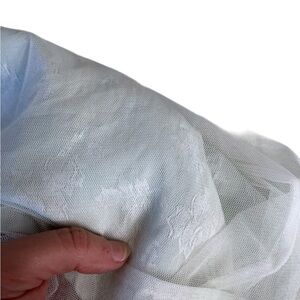 Pictures do not do this skirt justice! Beautiful mint color perfect condition lining with delicate floral pattern. Overlay with white nylon sheer material. Great movement and drape. No damage apparent over garment- no pulls or tears noted. Freshly cleaned, no overpowering smells.
