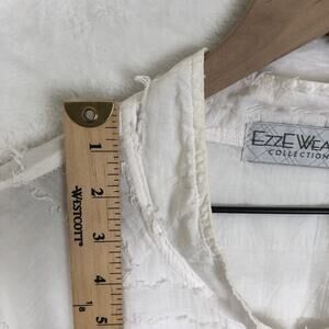 This Vintage EZZEWEAR Tunic Top is a stylish and versatile women's blouse in size Medium. Made from 100% cotton with a solid white color and short casual sleeves, this top features a collared neckline and button up closure. The raw edge detail adds a unique touch to this wardrobe staple, perfect for a casual occasion or any season. The Ezzewear brand ensures quality and style, with a regular fit and tunic style that embodies a bohemian and 90s theme.