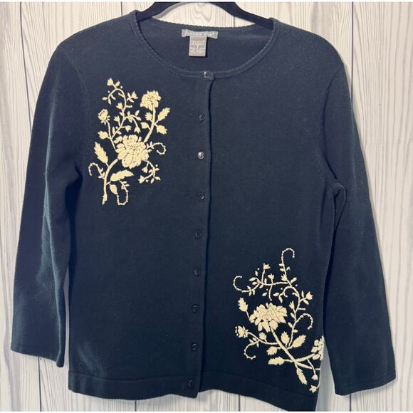 VTG Eagle Eye Black Cardigan Cream Floral Decor Button Up Size Small