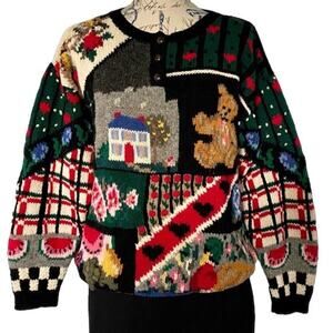 Gorgeous hand knit vintage ( 1989) wool patchwork novelty pull over sweater. In great used condition