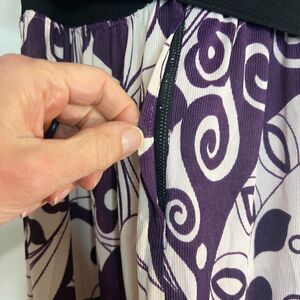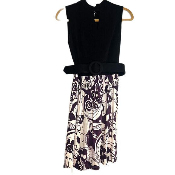 Vintage Early 60's Mini dress with black top with Keyhole neck, cap sleeves, metal center back zipper,, and self belt with Round buckle. Off-white skirt with purple flower swirl skirt. Skirt has minor color bleed so the ground looks pinkish depending on light and some color fading in a few spots. Barely noticeable with busy purple print see pictures. Metal zipper down back center. Black color of zipper is worn off in parts. Vintage size 12 - but measures closer to an modern Small please see measurements