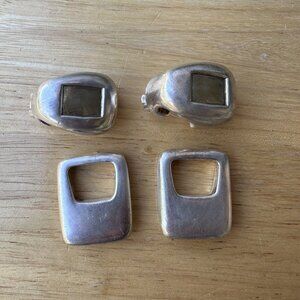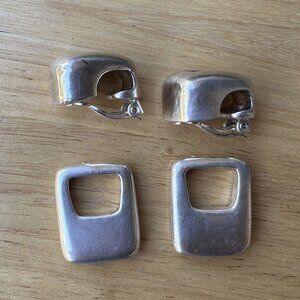 Add a touch of elegance to your outfit with these vintage electroform stamped 925 sterling silver earrings. The clip-on closure makes them easy to wear, and the dangle/drop style adds a touch of sophistication. These earrings are handmade and customized, with a modernist and retro theme that makes them perfect for Christmas, anniversaries, and birthdays. The earrings are made of high-quality metal and have a silver finish. They weigh 23.1 grams and have geometric shapes. These are possible early Simon Sebbag earrings or where created by a silversmith whom attempted to copy SSD for a customer. We examined these under a trinocular microscope and only were able to locate the 925 stamping. The earrings are hollow and light weight and are technically the same as 1980s-1990s vintage convertible earrings. The rectangular embossed tray on the body of the clips has a gold tone color hue. Condition shows use wear on surfaces however the spring in the clips is still tight with smooth operations.