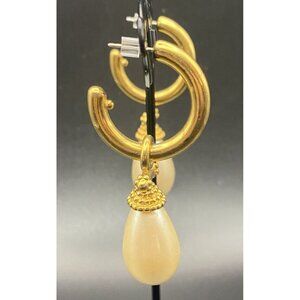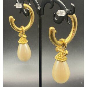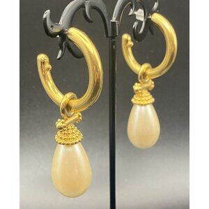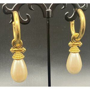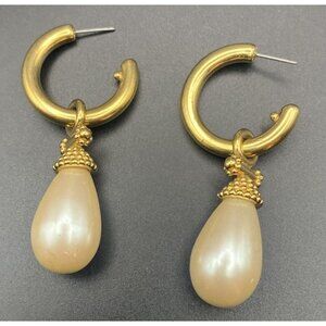 VTG Earrings Kramer Gold Faux Pearl Drop Hoop Pierced Signed Elegant Regency