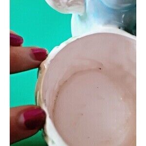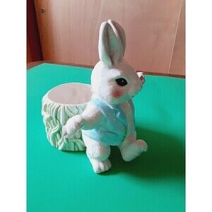 Vintage Bunny Rabbit NEW HOLLAND FLORAL Ceramic Planter 7" Easter Vase Flowers Up for sale is a super cute "VESTED RABBITS" Easter Bunny ceramic planter/vase made by New Holland Floral Inc. This guy is very cute with it's pastel colors and tulip floral theme. Has a nice light blue vest along with pink tulips and green grass. Has a gloss finish to it. It measures about 6 inches long, 7 inches tall, and 5 inches wide if you measure the space between his arms. Has two tiny "chips" or more like rough spots on the inner edge of the planter. I did try to take close up pictures of this so you can see. It isn't anything horrible. I think it just happened when the original owner took out that floral foam and it probably chipped the glaze. Overall a great vintage Easter piece that needs to find a new home. Thanks for looking!
