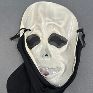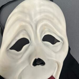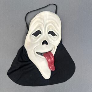 vintage halloween, 90s parody mask, ghost face spoof, scary movie style, tongue out mask, horror comedy costume, slasher parody, collectible mask, retro costume prop, haunted house décor, cosplay accessory, funny halloween costume