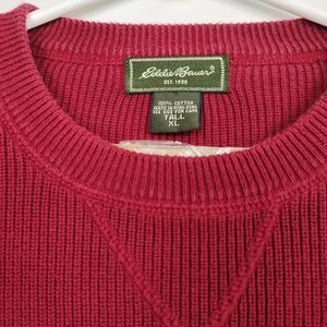 The product is a vintage Eddie Bauer men's pullover sweater in dark red, made of tight-knit cotton fabric. It features a crew neck, long sleeves, and a regular fit in size XL Tall. This classic sweater is machine washable and perfect for everyday wear in the colder months, adding a touch of style and comfort to any outfit.