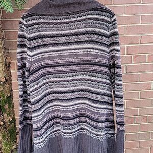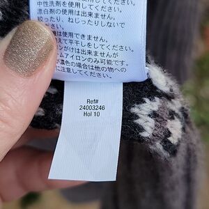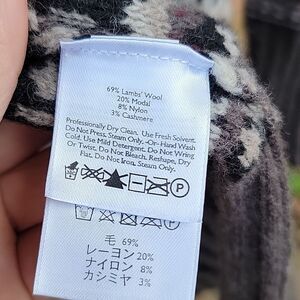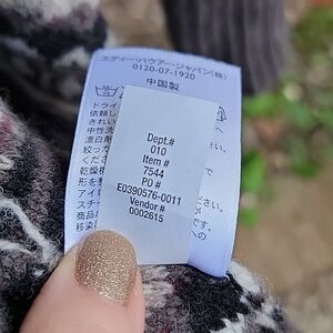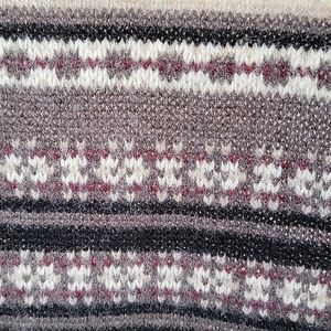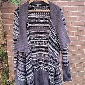 Great condition unique long duster sweater by Eddie Bauer. Marked size M/L. Open, with included pin to close. Fair Fair isle knit inside out. Neutral colors. 69% wool, 20% modal, 8% nylon. 3% cashmere. Long open cardigan with ribknit trim cuffs and collar, closure pin included. Lagenlook cottagecore bohemian style, one of a kind piece. No defects.